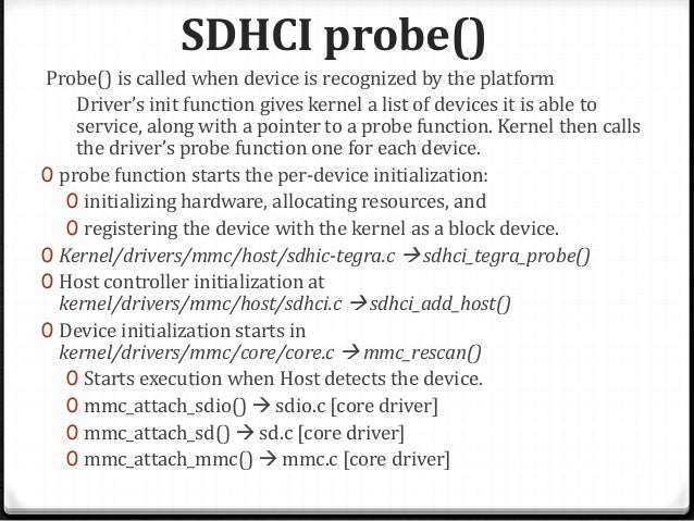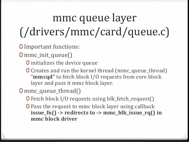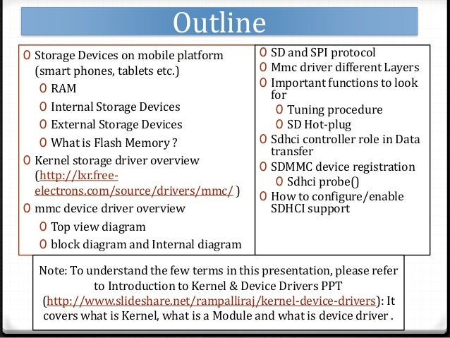 It describes the MMC storage device driver functionality in Linux Kernel and it's role. It explains different type of storage devices available and how they are handled from MMC driver point of view. It describes eMMC (internal storage) device and SD (external storage) devices in details and SD protocol used for communicating with these devices in Linux.