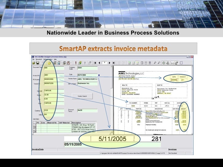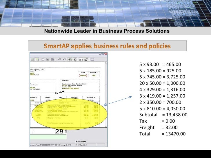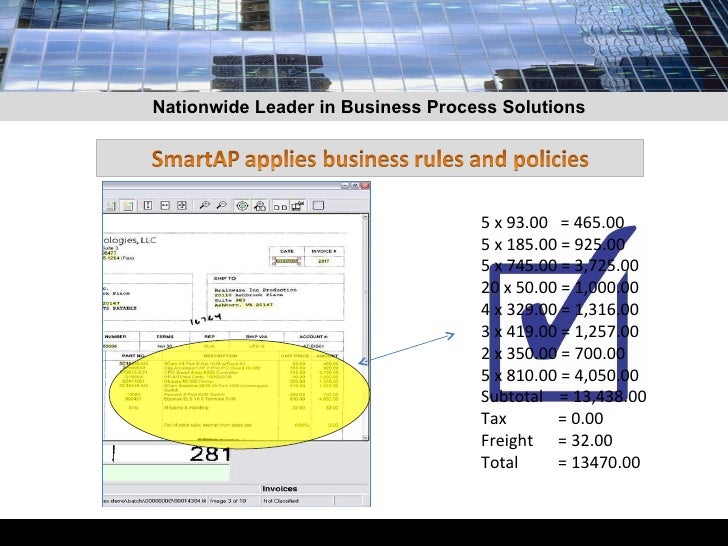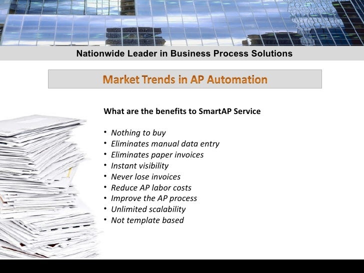 10. 10. <ul><li>What are the benefits to SmartAP Service </li></ul><ul><li>Nothing to buy </li></ul><ul><li>Eliminates manual data entry </li></ul><ul><li>Eliminates paper invoices </li></ul><ul><li>Instant visibility </li></ul><ul><li>Never lose invoices </li></ul><ul><li>Reduce AP labor costs </li></ul><ul><li>Improve the AP process </li></ul><ul><li>Unlimited scalability </li></ul><ul><li>Not template based </li></ul>Nationwide Leader in Business Process Solutions