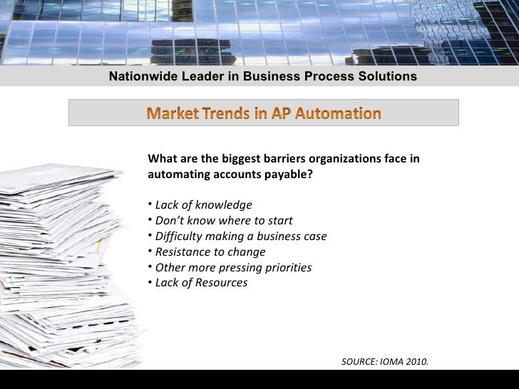 2. 2. <ul><li>What are the biggest barriers organizations face in automating accounts payable? </li></ul><ul><li>Lack of knowledge </li></ul><ul><li>Don’t know where to start </li></ul><ul><li>Difficulty making a business case </li></ul><ul><li>Resistance to change </li></ul><ul><li>Other more pressing priorities </li></ul><ul><li>Lack of Resources </li></ul><ul><li> SOURCE: IOMA 2010. </li></ul>Nationwide Leader in Business Process Solutions