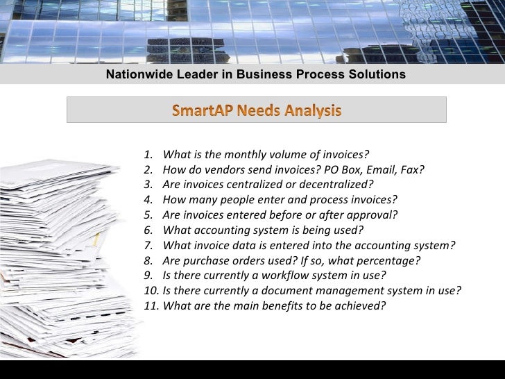 27. 27. <ul><li>What is the monthly volume of invoices? </li></ul><ul><li>How do vendors send invoices? PO Box, Email, Fax? </li></ul><ul><li>Are invoices centralized or decentralized? </li></ul><ul><li>How many people enter and process invoices? </li></ul><ul><li>Are invoices entered before or after approval? </li></ul><ul><li>What accounting system is being used? </li></ul><ul><li>What invoice data is entered into the accounting system? </li></ul><ul><li>Are purchase orders used? If so, what percentage? </li></ul><ul><li>Is there currently a workflow system in use? </li></ul><ul><li>Is there currently a document management system in use? </li></ul><ul><li>What are the main benefits to be achieved? </li></ul>Nationwide Leader in Business Process Solutions
