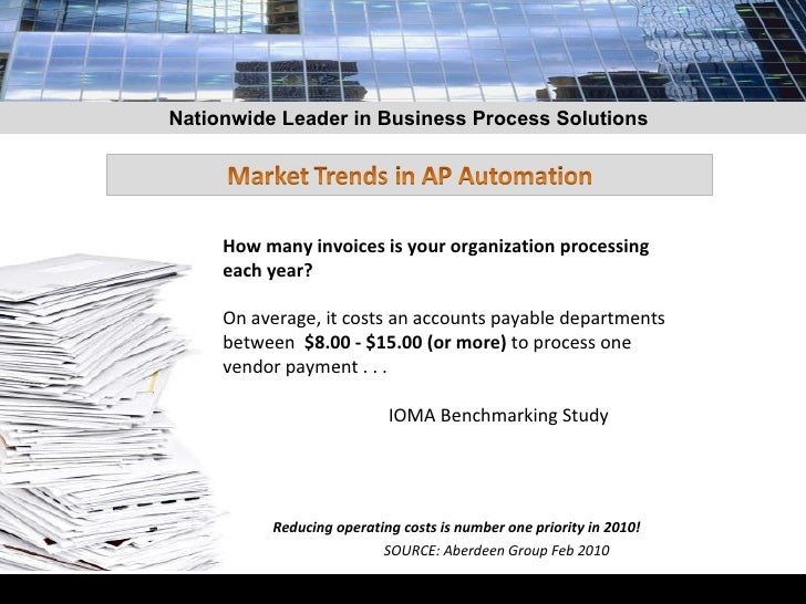 3. 3. <ul><li>Top 10 Reasons to Automate Accounts Payable </li></ul><ul><li>Reduce Costs </li></ul><ul><li>Increase Efficiencies </li></ul><ul><li>Eliminate Errors </li></ul><ul><li>Prevent Fraud </li></ul><ul><li>Capture Discounts </li></ul><ul><li>Improve Cash Flow </li></ul><ul><li>Increase Visibility </li></ul><ul><li>Free Up Staff Time </li></ul><ul><li>Improve AP Department </li></ul><ul><li>Automating AP is Not Difficult </li></ul><ul><li>SOURCE: IOMA 2010. </li></ul>Nationwide Leader in Business Process Solutions