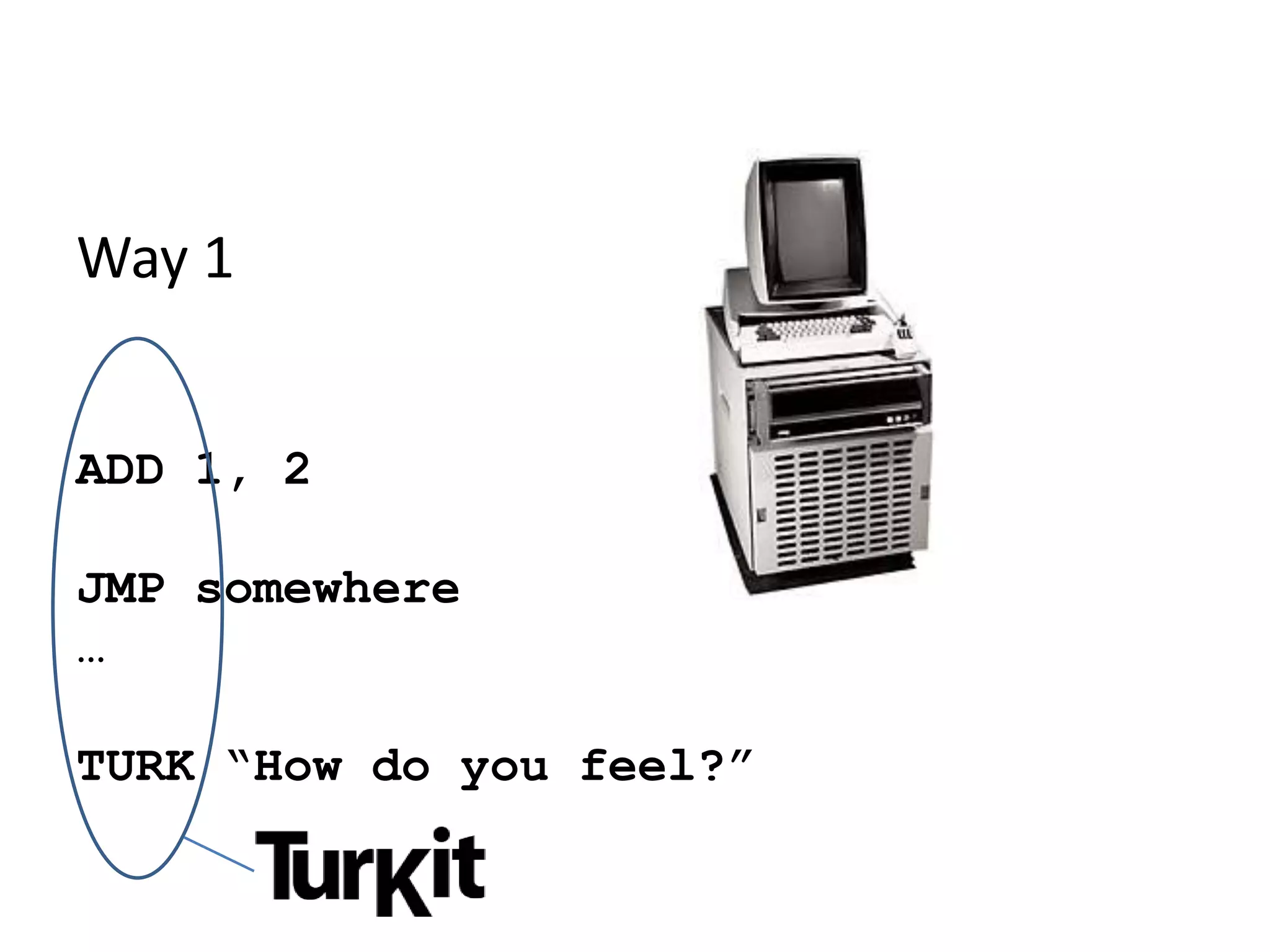 10. 10. Way 1<br />ADD 1, 2<br />JMP somewhere<br />…<br />TURK “How do you feel?”<br />