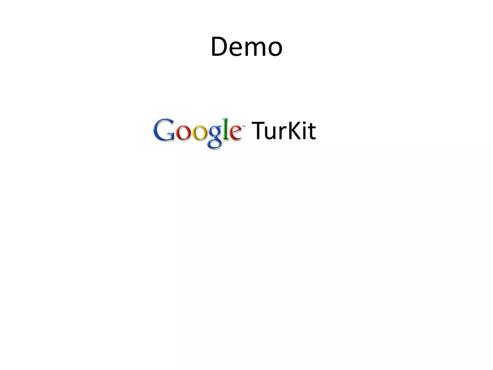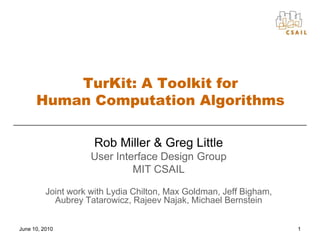 1. 1. 1<br />TurKit: A Toolkit for Human Computation Algorithms<br />Rob Miller & Greg Little<br />User Interface Design Group<br />MIT CSAIL<br />Joint work with Lydia Chilton, Max Goldman, Jeff Bigham, Aubrey Tatarowicz, Rajeev Najak, Michael Bernstein<br />June 10, 2010<br />