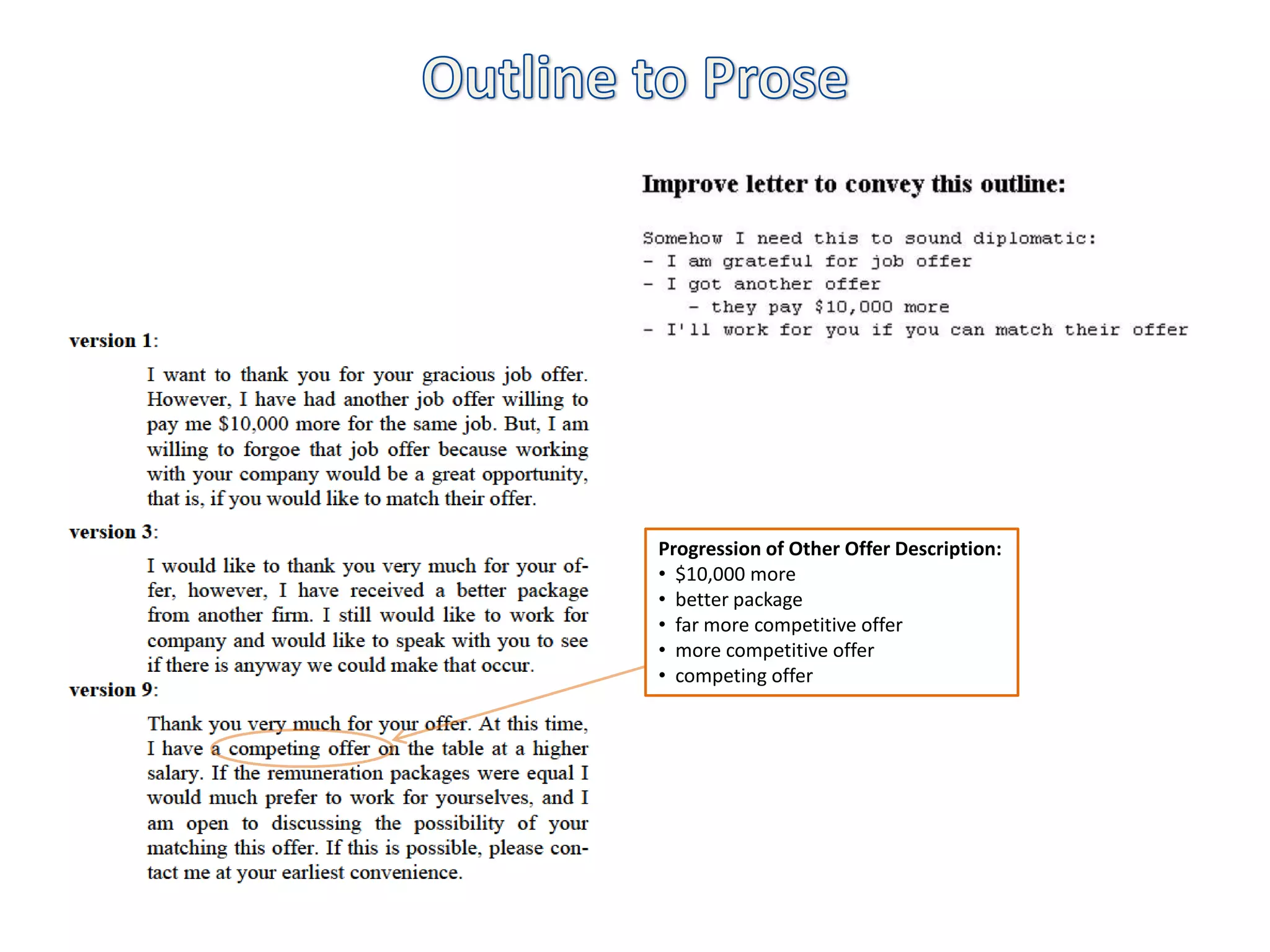 34. 34. Outline to Prose<br />Progression of Other Offer Description:<br /><ul><li> $10,000 more