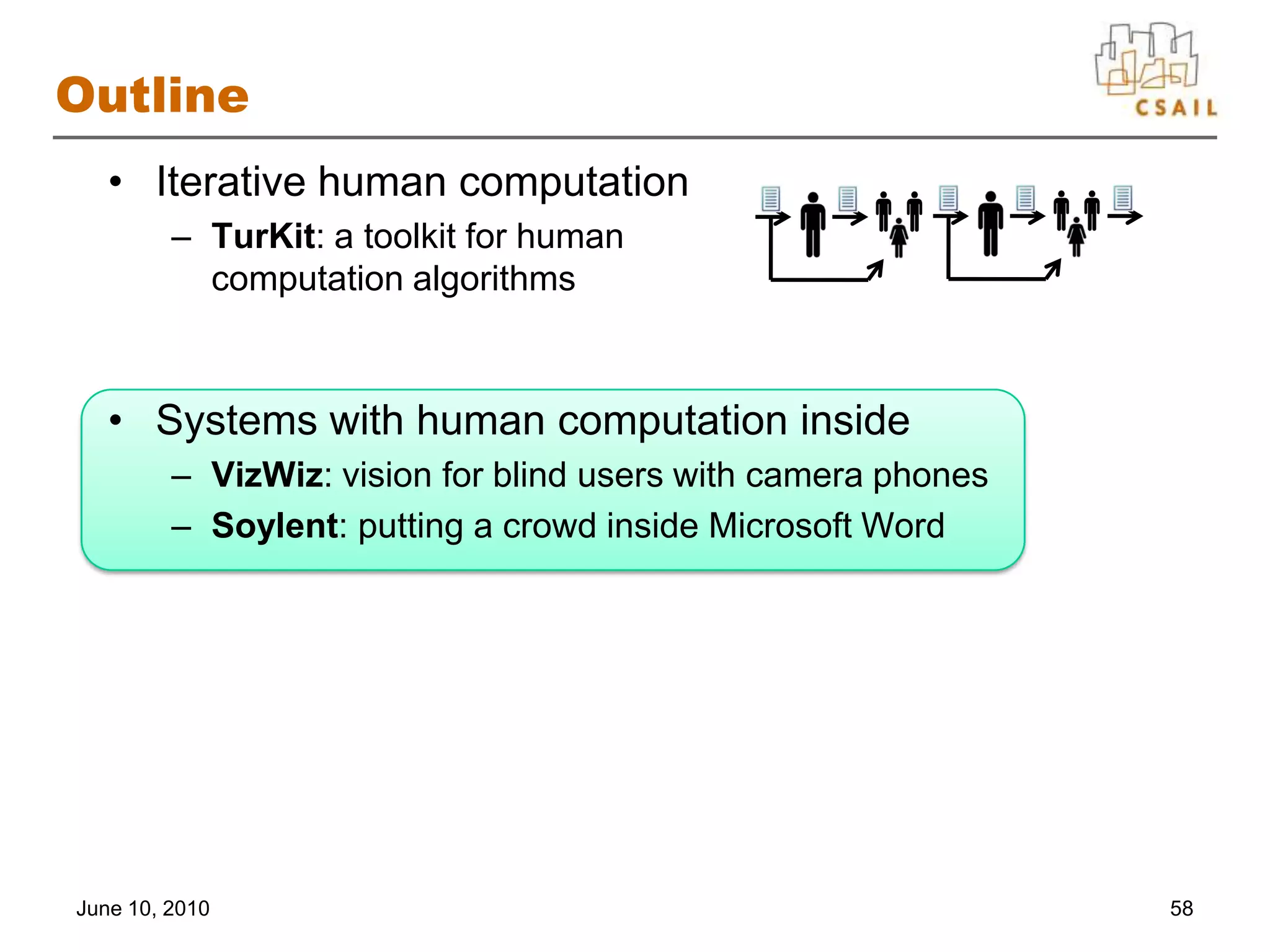 61. 61. Outline<br />Iterative human computation<br />TurKit: a toolkit for human computation algorithms<br />Systems with human computation inside<br />VizWiz: vision for blind users with camera phones<br />Soylent: putting a crowd inside Microsoft Word<br />June 10, 2010<br />58<br />