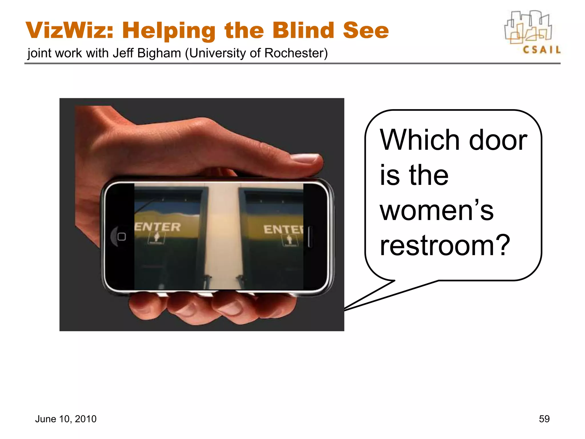 62. 62. VizWiz: Helping the Blind See<br />59<br />joint work with Jeff Bigham (University of Rochester)<br />Which door is the women’s restroom?<br />June 10, 2010<br />