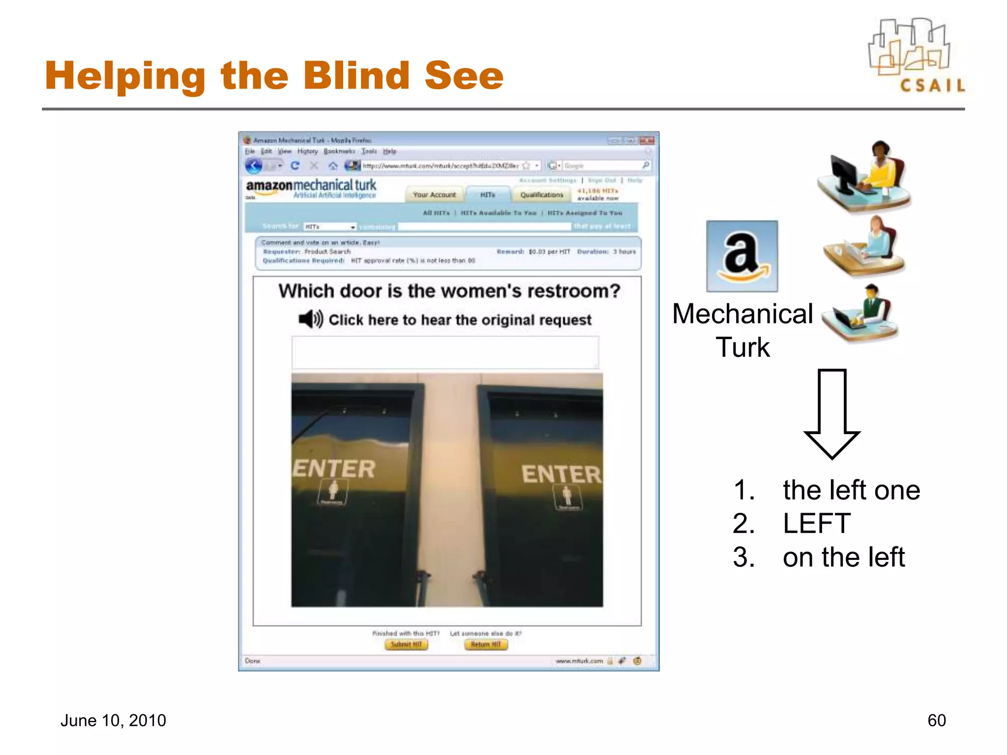 63. 63. Helping the Blind See<br />60<br />MechanicalTurk<br />the left one<br />LEFT<br />on the left<br />June 10, 2010<br />