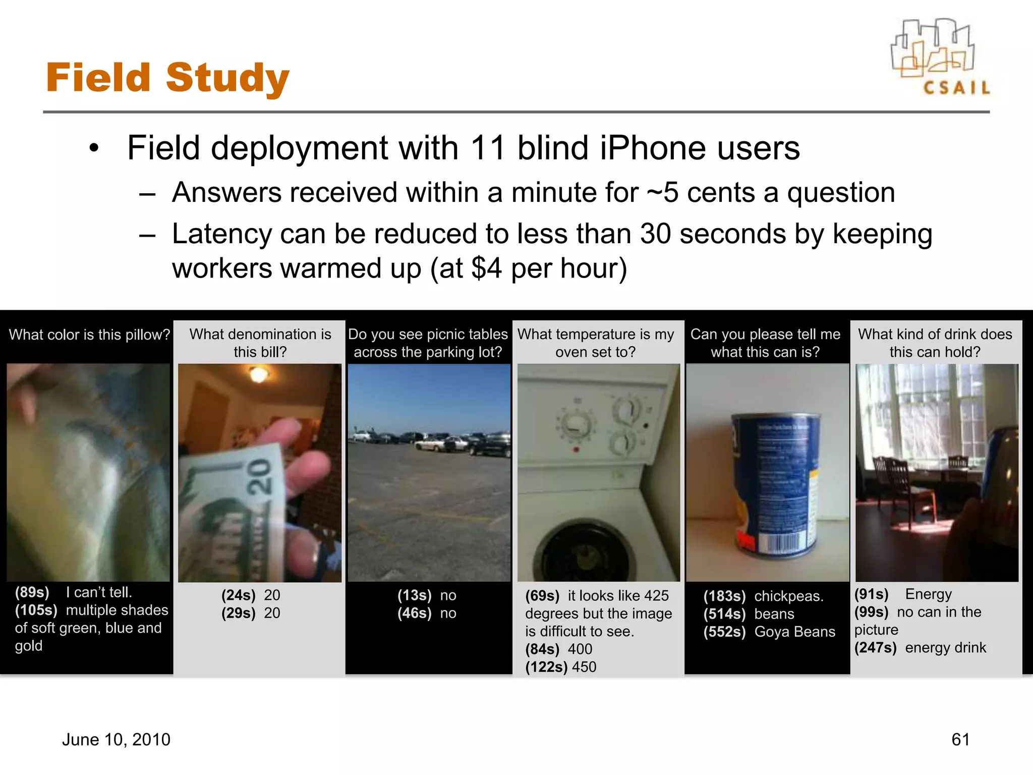 64. 64. Field Study<br />Field deployment with 11 blind iPhone users<br />Answers received within a minute for ~5 cents a question<br />Latency can be reduced to less than 30 seconds by keeping workers warmed up (at $4 per hour)<br />June 10, 2010<br />61<br />