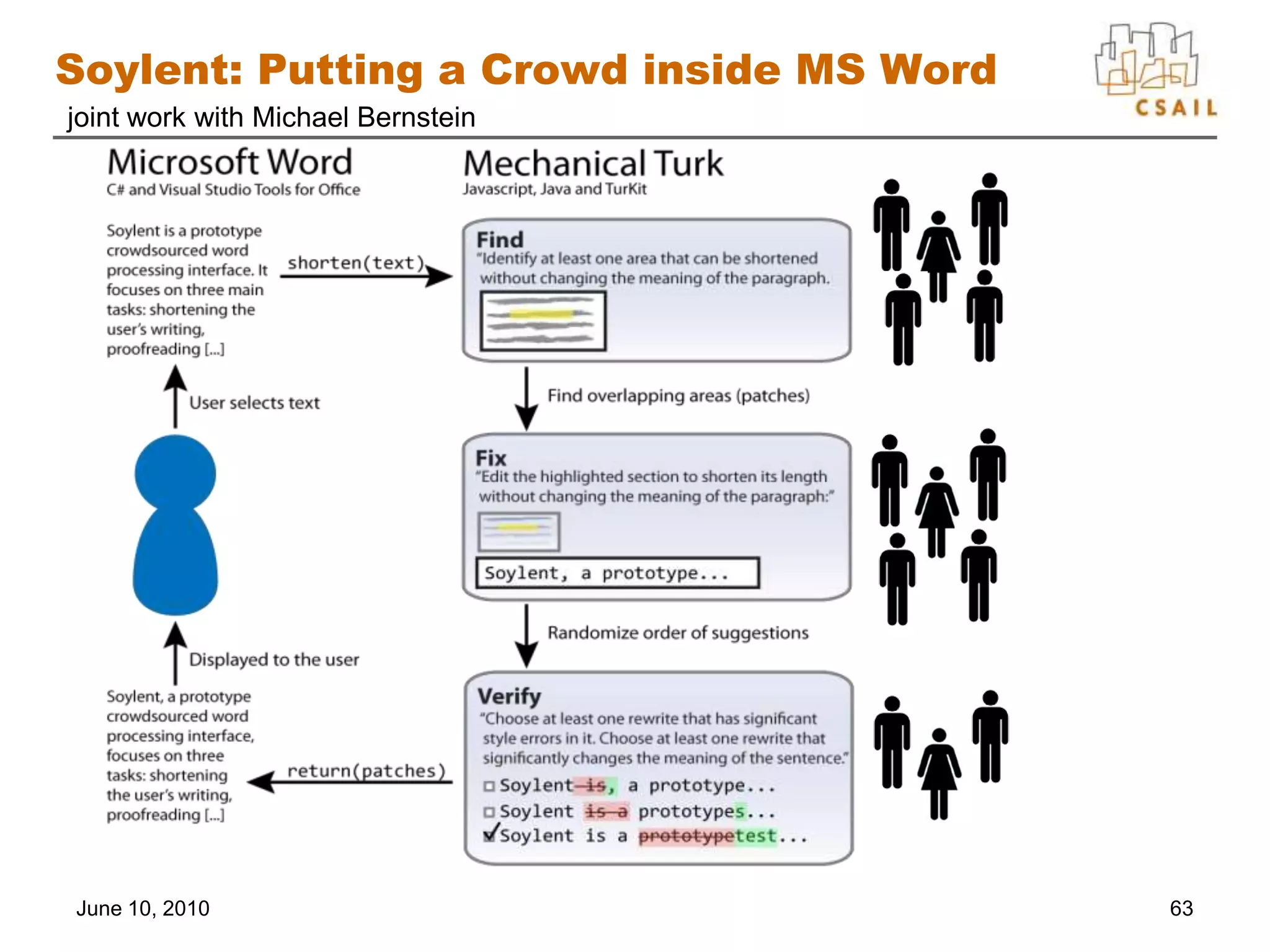 66. 66. Soylent: Putting a Crowd inside MS Word<br />June 10, 2010<br />joint work with Michael Bernstein<br />63<br />