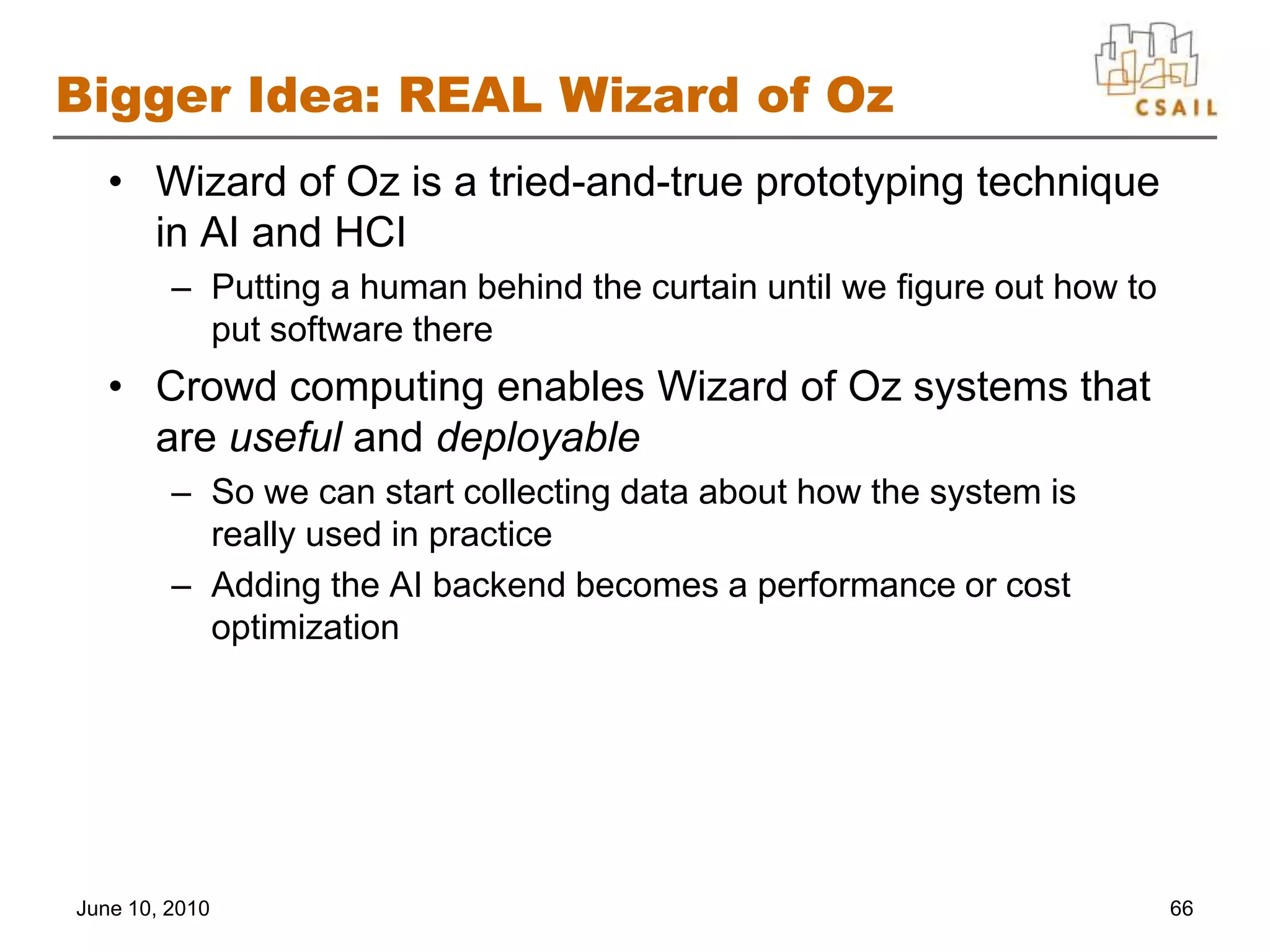 69. 69. Bigger Idea: REAL Wizard of Oz <br />Wizard of Oz is a tried-and-true prototyping technique in AI and HCI<br />Putting a human behind the curtain until we figure out how to put software there<br />Crowd computing enables Wizard of Oz systems that are useful and deployable<br />So we can start collecting data about how the system is really used in practice<br />Adding the AI backend becomes a performance or cost optimization<br />66<br />June 10, 2010<br />
