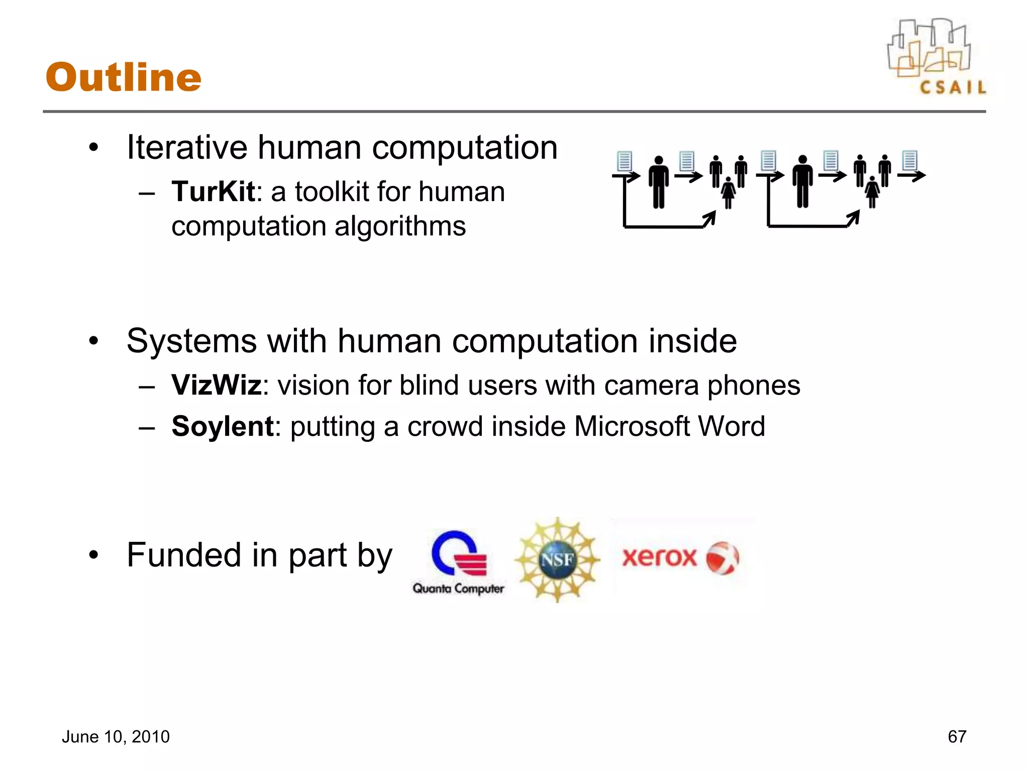 70. 70. Outline<br />Iterative human computation<br />TurKit: a toolkit for human computation algorithms<br />Systems with human computation inside<br />VizWiz: vision for blind users with camera phones<br />Soylent: putting a crowd inside Microsoft Word<br />Funded in part by <br />June 10, 2010<br />67<br />