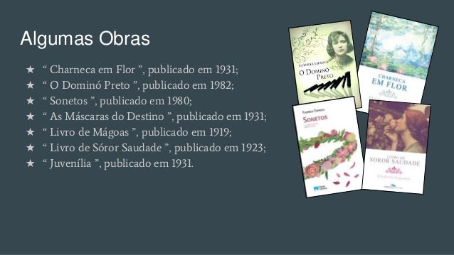 10. 10. Algumas Obras ★ “ Charneca em Flor ”, publicado em 1931; ★ “ O Dominó Preto ”, publicado em 1982; ★ “ Sonetos ”, publicado em 1980; ★ “ As Máscaras do Destino ”, publicado em 1931; ★ “ Livro de Mágoas ”, publicado em 1919; ★ “ Livro de Sóror Saudade ”, publicado em 1923; ★ “ Juvenília ”, publicado em 1931.