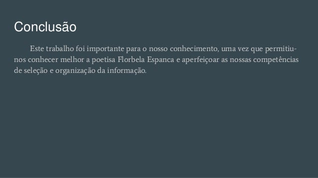 11. 11. Conclusão Este trabalho foi importante para o nosso conhecimento, uma vez que permitiu- nos conhecer melhor a poetisa Florbela Espanca e aperfeiçoar as nossas competências de seleção e organização da informação.