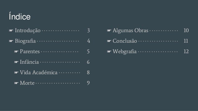 2. 2. Índice ☛ Introdução · · · · · · · · · · · · · · · · · 3 ☛ Biografia · · · · · · · · · · · · · · · · · · · 4 ☛ Parentes · · · · · · · · · · · · · · · · · 5 ☛ Infância · · · · · · · · · · · · · · · · · · 6 ☛ Vida Académica · · · · · · · · · · 8 ☛ Morte · · · · · · · · · · · · · · · · · · · · 9 ☛ Algumas Obras · · · · · · · · · · · · · 10 ☛ Conclusão · · · · · · · · · · · · · · · · · · 11 ☛ Webgrafia · · · · · · · · · · · · · · · · · · 12