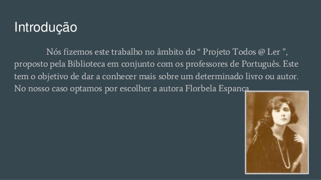 3. 3. Introdução Nós fizemos este trabalho no âmbito do “ Projeto Todos @ Ler ”, proposto pela Biblioteca em conjunto com os professores de Português. Este tem o objetivo de dar a conhecer mais sobre um determinado livro ou autor. No nosso caso optamos por escolher a autora Florbela Espanca.