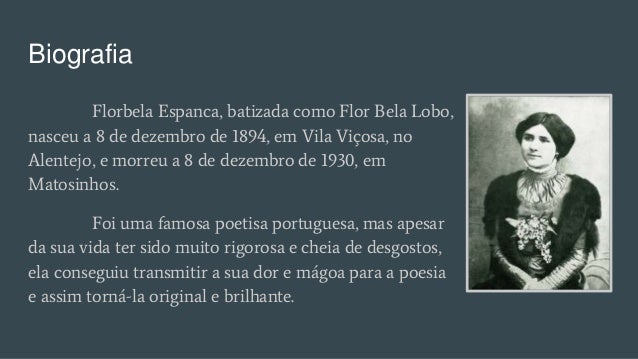 4. 4. Biografia Florbela Espanca, batizada como Flor Bela Lobo, nasceu a 8 de dezembro de 1894, em Vila Viçosa, no Alentejo, e morreu a 8 de dezembro de 1930, em Matosinhos. Foi uma famosa poetisa portuguesa, mas apesar da sua vida ter sido muito rigorosa e cheia de desgostos, ela conseguiu transmitir a sua dor e mágoa para a poesia e assim torná-la original e brilhante.