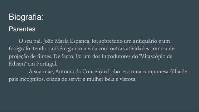 5. 5. Biografia: O seu pai, João Maria Espanca, foi sobretudo um antiquário e um fotógrafo, tendo também ganho a vida com outras atividades como a de projeção de filmes. De facto, foi um dos introdutores do "Vitascópio de Edison" em Portugal. A sua mãe, Antónia da Conceição Lobo, era uma camponesa filha de pais incógnitos, criada de servir e mulher bela e vistosa. Parentes