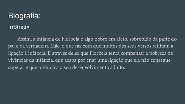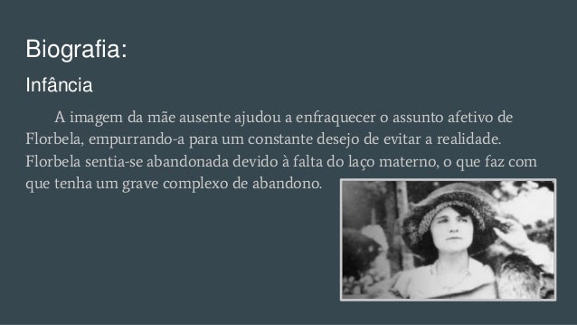 6. 6. Biografia: A imagem da mãe ausente ajudou a enfraquecer o assunto afetivo de Florbela, empurrando-a para um constante desejo de evitar a realidade. Florbela sentia-se abandonada devido à falta do laço materno, o que faz com que tenha um grave complexo de abandono. Infância