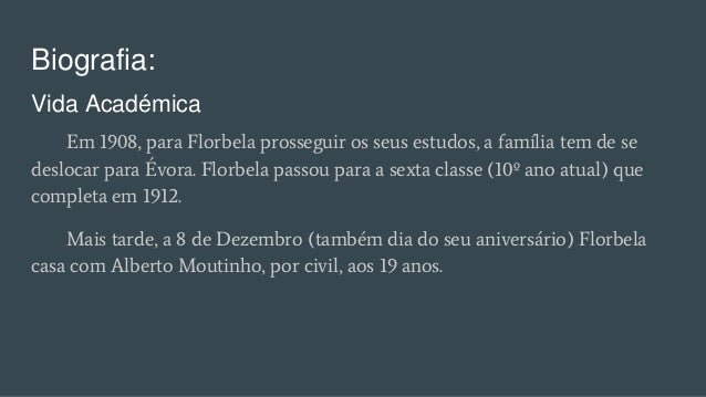 8. 8. Biografia: Em 1908, para Florbela prosseguir os seus estudos, a família tem de se deslocar para Évora. Florbela passou para a sexta classe (10º ano atual) que completa em 1912. Mais tarde, a 8 de Dezembro (também dia do seu aniversário) Florbela casa com Alberto Moutinho, por civil, aos 19 anos. Vida Académica