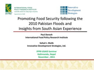 "Lessons and policy options for emergency preparedness in flood prone areas of Asia” presented by Sohail Malik and Paul Dorosh, IFPRI, at the ReSAKSS-Asia Conference, Nov 14-16, 2011, in Kathmandu, Nepal.