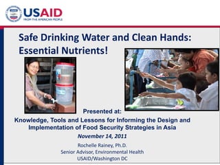 “Safe drinking water and clean hands: Essential nutrients!” presented by Rochelle Rainey, USAID Global Health Bureau at the ReSAKSS-Asia Conference, Nov 14-16, 2011, in Kathmandu, Nepal.