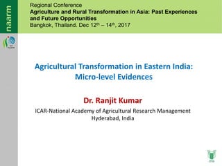 Dr. Ranjit Kumar, ICAR-National Academy of Agricultural Research Management, Hyderabad, India Presented at the ReSAKSS-Asia conference “Agriculture and Rural Transformation in Asia: Past Experiences and Future Opportunities”. An international conference jointly organized by ReSAKSS-Asia, IFPRI, TDRI, and TVSEP project of Leibniz Universit Hannover with support from USAID and Deutsche Forschungsgemeinschaft (DFG) at the Dusit Thani Hotel, Bangkok, Thailand December 12–14, 2017.