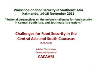 "Regional perspectives on the unique challenges for food security in Central Asia", presented by Alisher Tashmatov, Executive Secretary, Caucasus Association of Agricultural Research Institutions (CACAARI), at the ReSAKSS-Asia Conference, Nov 14-16, 2011, in Kathmandu, Nepal.