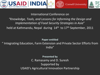 “Cornell University and Sathguru Engagement in Agriculture Development In South Asia - 1994 - 2011” presented by Chinnachamy Ramasamy and Damodaran Suresh, Cornell University, at the ReSAKSS-Asia Conference, Nov 14-16, 2011, in Kathmandu, Nepal.