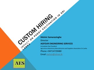 Melvin Samarasinghe, Director, Agfour Engineering Services Presented at the ReSAKSS-Asia conference “Agriculture and Rural Transformation in Asia: Past Experiences and Future Opportunities”. An international conference jointly organized by ReSAKSS-Asia, IFPRI, TDRI, and TVSEP project of Leibniz Universit Hannover with support from USAID and Deutsche Forschungsgemeinschaft (DFG) at the Dusit Thani Hotel, Bangkok, Thailand December 12–14, 2017.