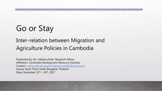 Vathana Roth, Research Fellow, Cambodia Development Resource Institute Presented at the ReSAKSS-Asia conference “Agriculture and Rural Transformation in Asia: Past Experiences and Future Opportunities”. An international conference jointly organized by ReSAKSS-Asia, IFPRI, TDRI, and TVSEP project of Leibniz Universit Hannover with support from USAID and Deutsche Forschungsgemeinschaft (DFG) at the Dusit Thani Hotel, Bangkok, Thailand December 12–14, 2017.