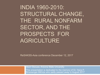 Alwin Dsouza, Arizona State University This presentation is dedicated to the memory of Dr. Hans P. Binswanger-Mkhize who sadly passed away in August 2017 Presented at the ReSAKSS-Asia conference “Agriculture and Rural Transformation in Asia: Past Experiences and Future Opportunities”. An international conference jointly organized by ReSAKSS-Asia, IFPRI, TDRI, and TVSEP project of Leibniz Universit Hannover with support from USAID and Deutsche Forschungsgemeinschaft (DFG) at the Dusit Thani Hotel, Bangkok, Thailand December 12–14, 2017.