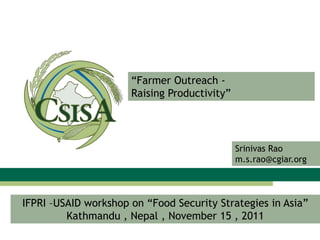 1. “Farmer Outreach - Raising Productivity” IFPRI –USAID workshop on “Food Security Strategies in Asia” Kathmandu , Nepal , November 15 , 2011 Srinivas Rao m.s.rao@cgiar.org