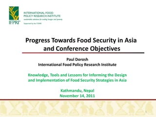 Overview of Workshop Objectives and Goals, presented by Paul Dorosh, Division Director, Development Strategies and Governance (DSG) Division, IFPRI, at the ReSAKSS-Asia Conference, Nov 14-16, 2011, in Kathmandu, Nepal.