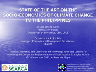 “State of socio-economic research on climate change and policy implications in the Philippines” presented by Mercedita A. Sombilla, SEARCA at the ReSAKSS-Asia Conference, Nov 14-16, 2011, in Kathmandu, Nepal.