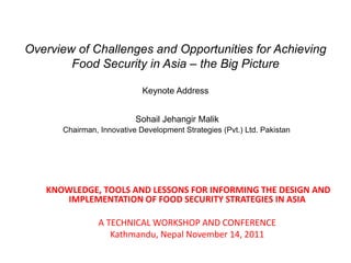 1. Overview of Challenges and Opportunities for Achieving Food Security in Asia – the Big Picture Keynote Address Sohail Jehangir Malik Chairman, Innovative Development Strategies (Pvt.) Ltd. Pakistan KNOWLEDGE, TOOLS AND LESSONS FOR INFORMING THE DESIGN AND IMPLEMENTATION OF FOOD SECURITY STRATEGIES IN ASIA A TECHNICAL WORKSHOP AND CONFERENCE Kathmandu, Nepal November 14, 2011