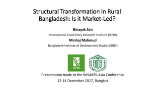 Binayak Sen, International Food Policy Research Institute (IFPRI) and Minhaj Mahmud, Bangladesh Institute of Development Studies (BIDS) Presented at the ReSAKSS-Asia conference “Agriculture and Rural Transformation in Asia: Past Experiences and Future Opportunities”. An international conference jointly organized by ReSAKSS-Asia, IFPRI, TDRI, and TVSEP project of Leibniz Universit Hannover with support from USAID and Deutsche Forschungsgemeinschaft (DFG) at the Dusit Thani Hotel, Bangkok, Thailand December 12–14, 2017.