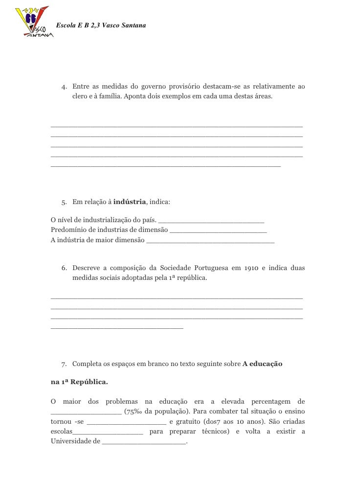 2. 2. Escola E B 2,3 Vasco Santana 4. Entre as medidas do governo provisório destacam-se as relativamente ao clero e à família. Aponta dois exemplos em cada uma destas áreas.________________________________________________________________________________________________________________________________________________________________________________________________________________________________________________________________________________________ 5. Em relação à indústria, indica:O nível de industrialização do país. ________________________Predomínio de industrias de dimensão ______________________A indústria de maior dimensão _____________________________ 6. Descreve a composição da Sociedade Portuguesa em 1910 e indica duas medidas sociais adoptadas pela 1ª república._________________________________________________________________________________________________________________________________________________________________________________________________________ 7. Completa os espaços em branco no texto seguinte sobre A educaçãona 1ª República.O maior dos problemas na educação era a elevada percentagem de________________ (75‰ da população). Para combater tal situação o ensinotornou -se __________________ e gratuito (dos7 aos 10 anos). São criadasescolas________________ para preparar técnicos) e volta a existir aUniversidade de ___________________.