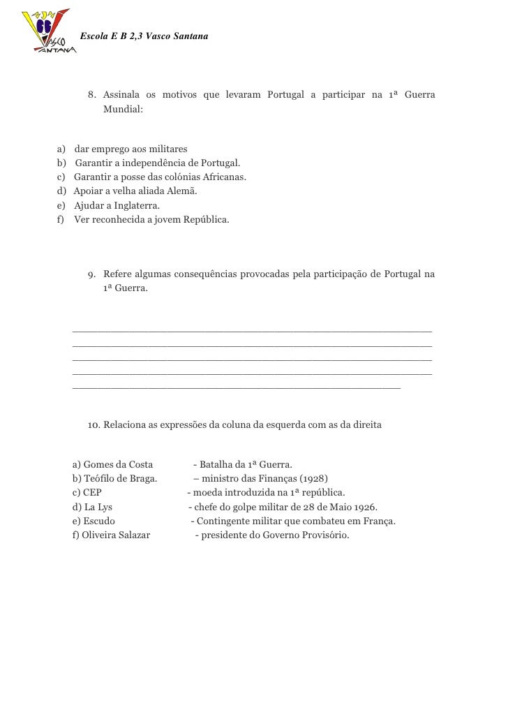 3. 3. Escola E B 2,3 Vasco Santana 8. Assinala os motivos que levaram Portugal a participar na 1ª Guerra Mundial:a) dar emprego aos militaresb) Garantir a independência de Portugal.c) Garantir a posse das colónias Africanas.d) Apoiar a velha aliada Alemã.e) Ajudar a Inglaterra.f) Ver reconhecida a jovem República. 9. Refere algumas consequências provocadas pela participação de Portugal na 1ª Guerra. _________________________________________________________ _________________________________________________________ _________________________________________________________ _________________________________________________________ ____________________________________________________ 10. Relaciona as expressões da coluna da esquerda com as da direita a) Gomes da Costa - Batalha da 1ª Guerra. b) Teófilo de Braga. – ministro das Finanças (1928) c) CEP - moeda introduzida na 1ª república. d) La Lys - chefe do golpe militar de 28 de Maio 1926. e) Escudo - Contingente militar que combateu em França. f) Oliveira Salazar - presidente do Governo Provisório.
