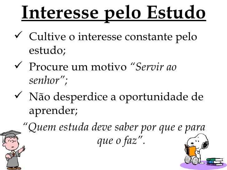 Interesse pelo Estudo <ul><li>Cultive o interesse constante pelo estudo; </li></ul><ul><li>Procure um motivo  “Servir ao s...