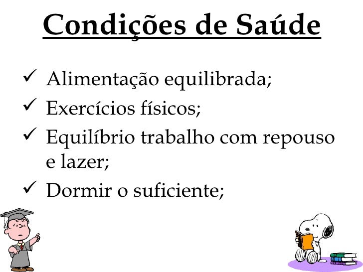 5. 5. Condições de Saúde <ul><li>Alimentação equilibrada; </li></ul><ul><li>Exercícios físicos; </li></ul><ul><li>Equilíbrio trabalho com repouso e lazer; </li></ul><ul><li>Dormir o suficiente; </li></ul>