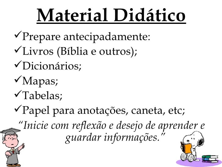 Material Didático <ul><li>Prepare antecipadamente: </li></ul><ul><li>Livros (Bíblia e outros); </li></ul><ul><li>Dicionári...