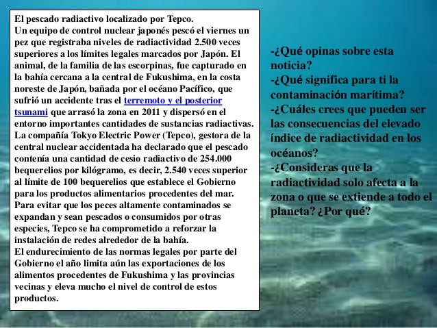 10. 10. El pescado radiactivo localizado por Tepco.Un equipo de control nuclear japonés pescó el viernes unpez que registraba niveles de radiactividad 2.500 vecessuperiores a los límites legales marcados por Japón. El -¿Qué opinas sobre estaanimal, de la familia de las escorpinas, fue capturado en noticia?la bahía cercana a la central de Fukushima, en la costa -¿Qué significa para ti lanoreste de Japón, bañada por el océano Pacífico, quesufrió un accidente tras el terremoto y el posterior contaminación marítima?tsunami que arrasó la zona en 2011 y dispersó en el -¿Cuáles crees que pueden serentorno importantes cantidades de sustancias radiactivas. las consecuencias del elevadoLa compañía Tokyo Electric Power (Tepco), gestora de la índice de radiactividad en loscentral nuclear accidentada ha declarado que el pescadocontenía una cantidad de cesio radiactivo de 254.000 océanos?bequerelios por kilógramo, es decir, 2.540 veces superior -¿Consideras que laal límite de 100 bequerelios que establece el Gobierno radiactividad solo afecta a lapara los productos alimentarios procedentes del mar. zona o que se extiende a todo elPara evitar que los peces altamente contaminados seexpandan y sean pescados o consumidos por otras planeta? ¿Por qué?especies, Tepco se ha comprometido a reforzar lainstalación de redes alrededor de la bahía.El endurecimiento de las normas legales por parte delGobierno el año limita aún las exportaciones de losalimentos procedentes de Fukushima y las provinciasvecinas y eleva mucho el nivel de control de estosproductos.