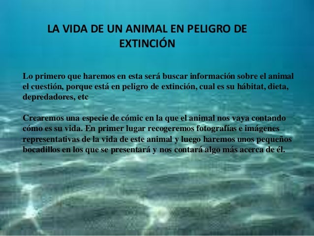 12. 12. LA VIDA DE UN ANIMAL EN PELIGRO DE EXTINCIÓNLo primero que haremos en esta será buscar información sobre el animalel cuestión, porque está en peligro de extinción, cual es su hábitat, dieta,depredadores, etcCrearemos una especie de cómic en la que el animal nos vaya contandocómo es su vida. En primer lugar recogeremos fotografías e imágenesrepresentativas de la vida de este animal y luego haremos unos pequeñosbocadillos en los que se presentará y nos contará algo más acerca de él.