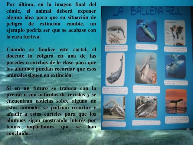 13. 13. Por último, en la imagen final delcómic, el animal deberá exponeralguna idea para que su situación depeligro de extinción cambie, unejemplo podría ser que se acabase conla caza furtiva.Cuando se finalice este cartel, eldocente lo colgará en una de lasparedes o corchos de la clase para quelos alumnos puedan recordar que esosanimales siguen en extinción.Si en un futuro se trabaja con laprensa o con artículos de revistas y seencuentran noticias sobre alguno deestos animales se podrían recortar yañadir a estos carteles para que losalumnos sigan mostrando interés portemas importantes que se hanconcluido.