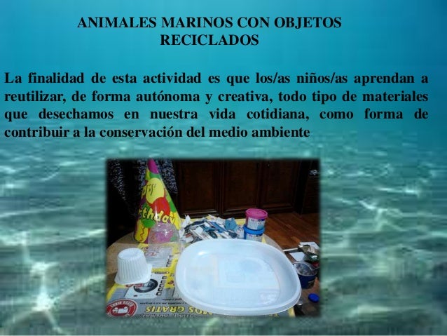 14. 14. ANIMALES MARINOS CON OBJETOS RECICLADOSLa finalidad de esta actividad es que los/as niños/as aprendan areutilizar, de forma autónoma y creativa, todo tipo de materialesque desechamos en nuestra vida cotidiana, como forma decontribuir a la conservación del medio ambiente