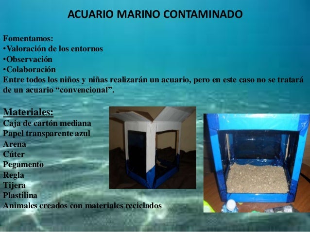 15. 15. ACUARIO MARINO CONTAMINADOFomentamos:•Valoración de los entornos•Observación•ColaboraciónEntre todos los niños y niñas realizarán un acuario, pero en este caso no se trataráde un acuario “convencional”.Materiales:Caja de cartón medianaPapel transparente azulArenaCúterPegamentoReglaTijeraPlastilinaAnimales creados con materiales reciclados