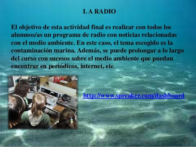 18. 18. L A RADIOEl objetivo de esta actividad final es realizar con todos losalumnos/as un programa de radio con noticias relacionadascon el medio ambiente. En este caso, el tema escogido es lacontaminación marina. Además, se puede prolongar a lo largodel curso con sucesos sobre el medio ambiente que puedanencontrar en periódicos, internet, etc. http://www.spreaker.com/dashboard