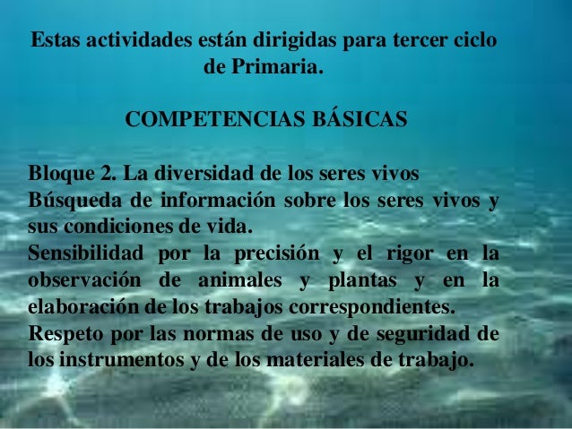 3. 3. Estas actividades están dirigidas para tercer ciclo de Primaria. COMPETENCIAS BÁSICASBloque 2. La diversidad de los seres vivosBúsqueda de información sobre los seres vivos ysus condiciones de vida.Sensibilidad por la precisión y el rigor en laobservación de animales y plantas y en laelaboración de los trabajos correspondientes.Respeto por las normas de uso y de seguridad delos instrumentos y de los materiales de trabajo.
