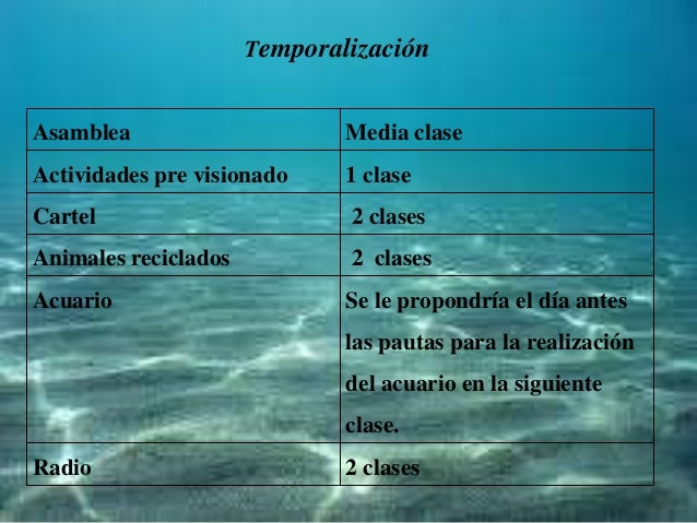 5. 5. TemporalizaciónAsamblea Media claseActividades pre visionado 1 claseCartel 2 clasesAnimales reciclados 2 clasesAcuario Se le propondría el día antes las pautas para la realización del acuario en la siguiente clase.Radio 2 clases