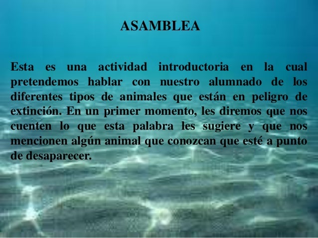 6. 6. ASAMBLEAEsta es una actividad introductoria en la cualpretendemos hablar con nuestro alumnado de losdiferentes tipos de animales que están en peligro deextinción. En un primer momento, les diremos que noscuenten lo que esta palabra les sugiere y que nosmencionen algún animal que conozcan que esté a puntode desaparecer.
